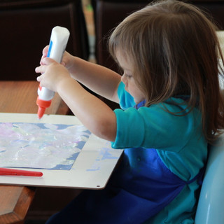 One day we couldn't make it oustide, the children worked on some winter-themed multimedia art. First, they got to experiment with color mixing as they combined white with hues of blue and purple, then they got to add texture and work on their hand strength as they squeezed glue and sprinkled Epsom salts onto their painting.