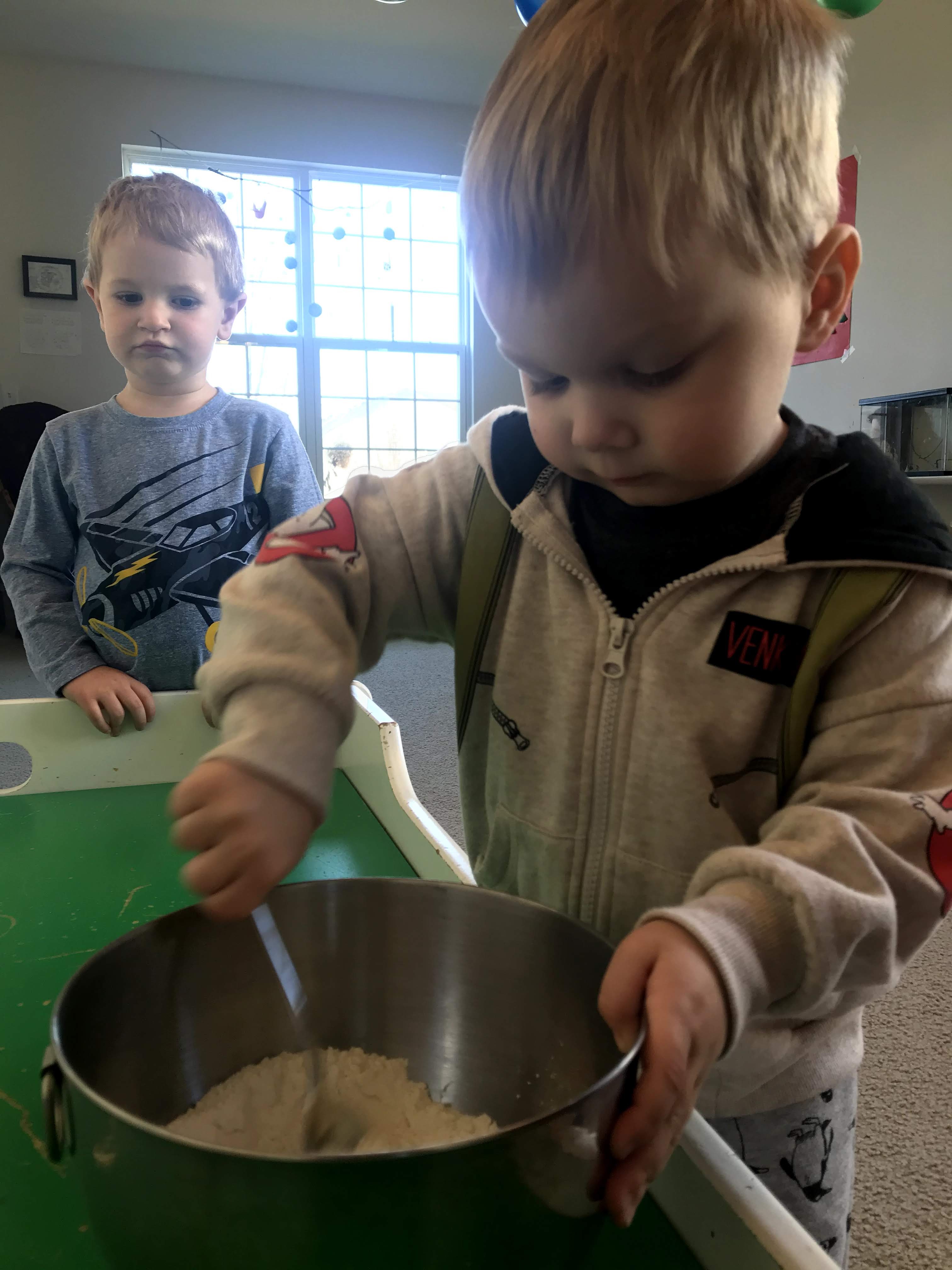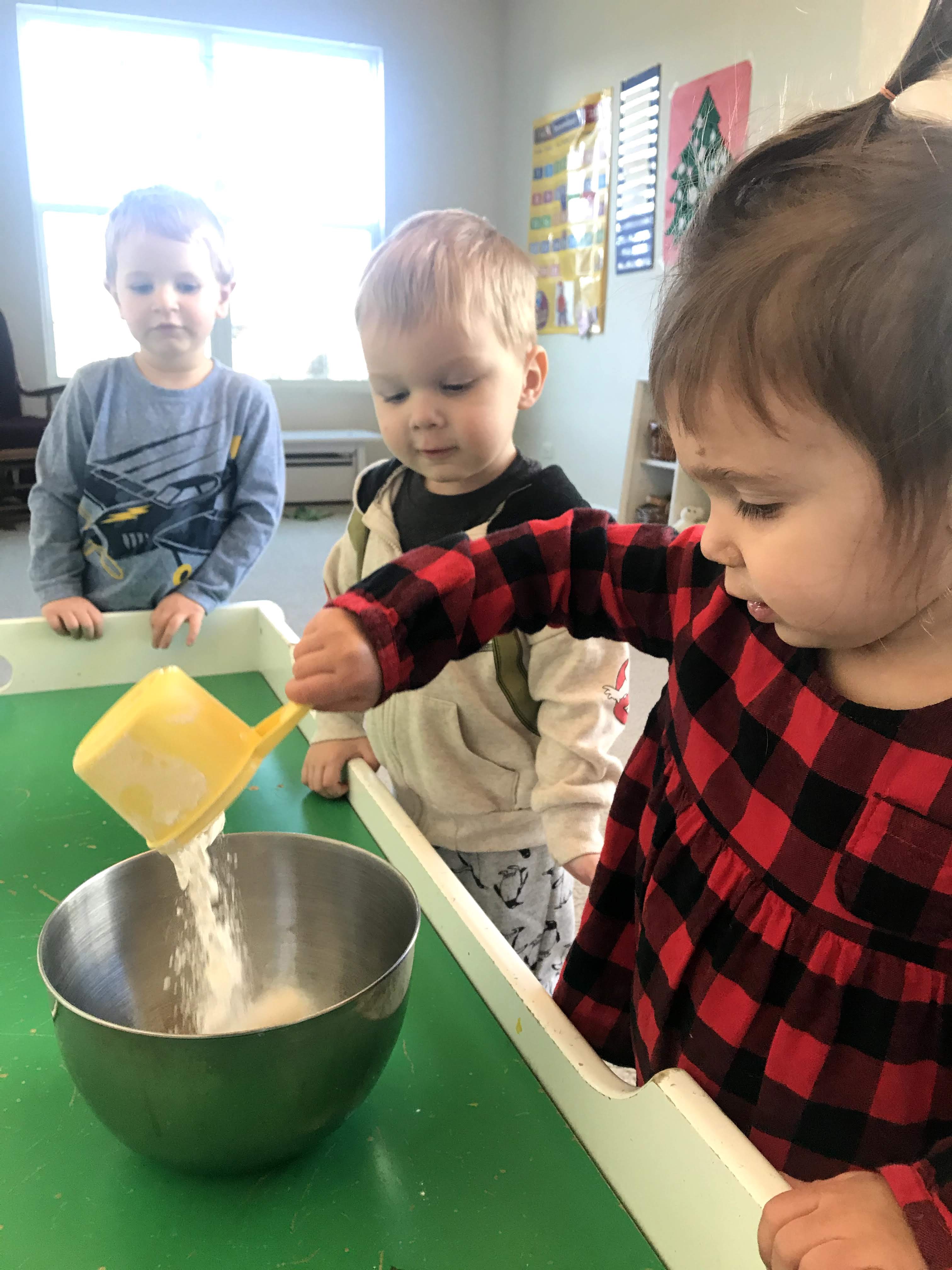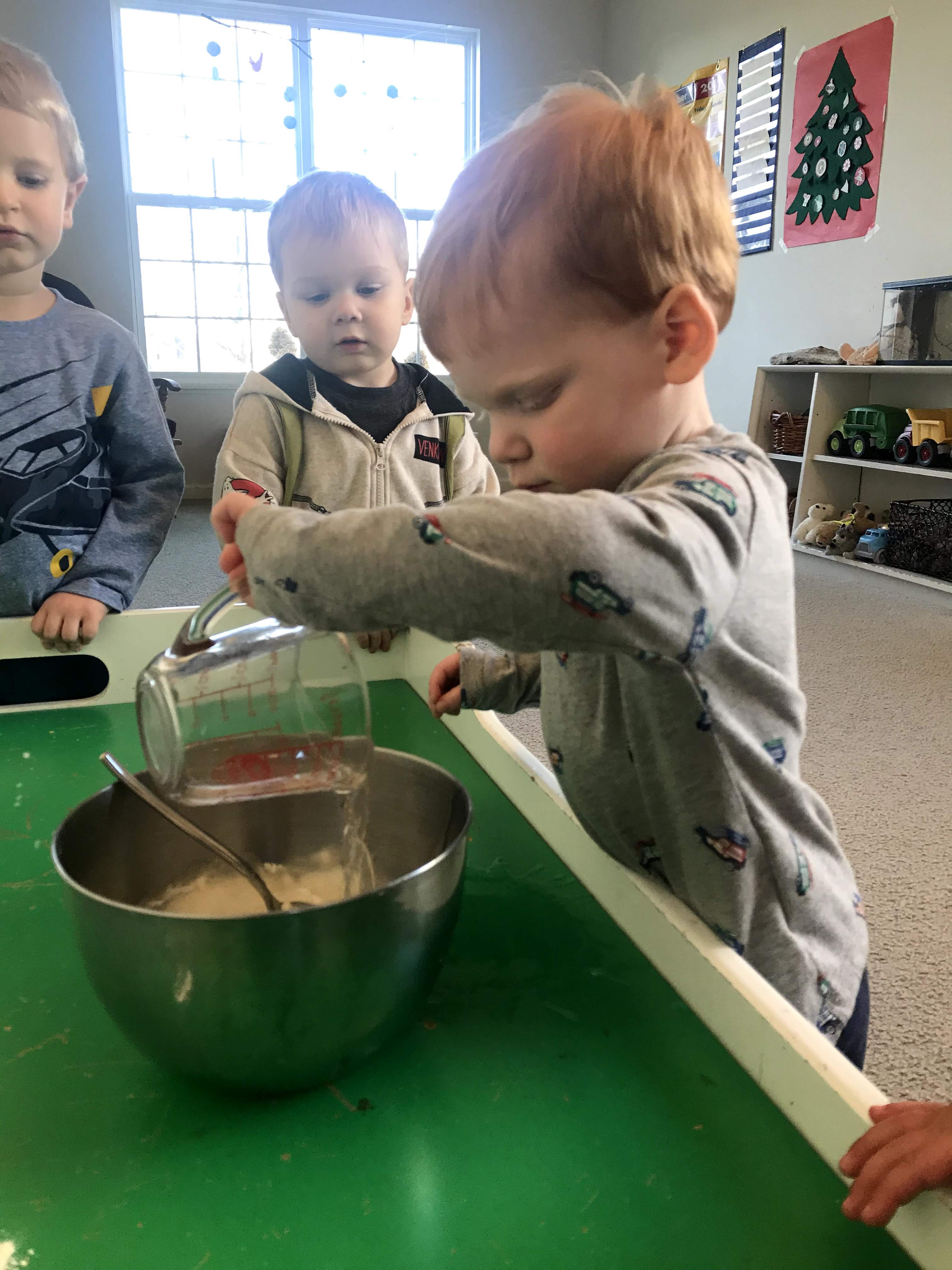 January was chilly, so having warm food was important to us. We made plenty of muffins to eat for lunch. Pictured below are the Blue Sky Daycare children preparing corn muffins. The children used fine muscle groups to scoop, dump, pour, and stir. They loved cooking just like grown-ups do, while more turn-taking taught patience and social conventions.