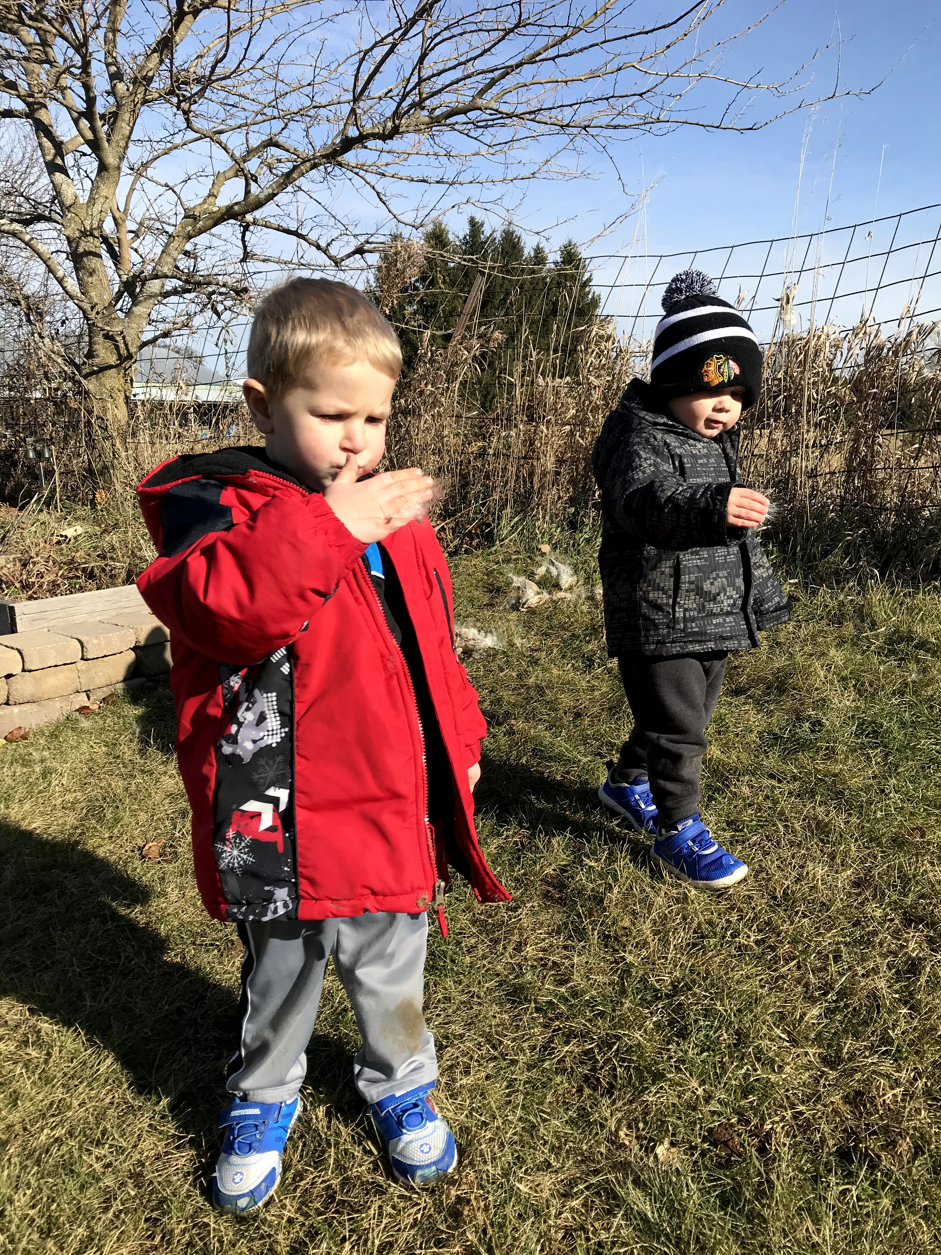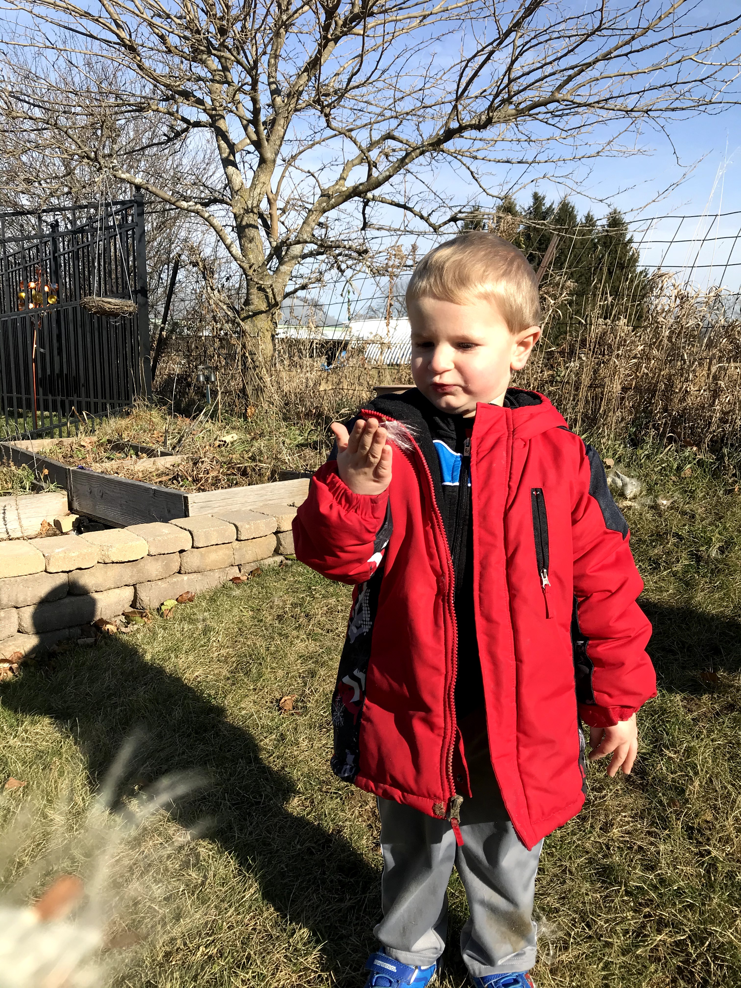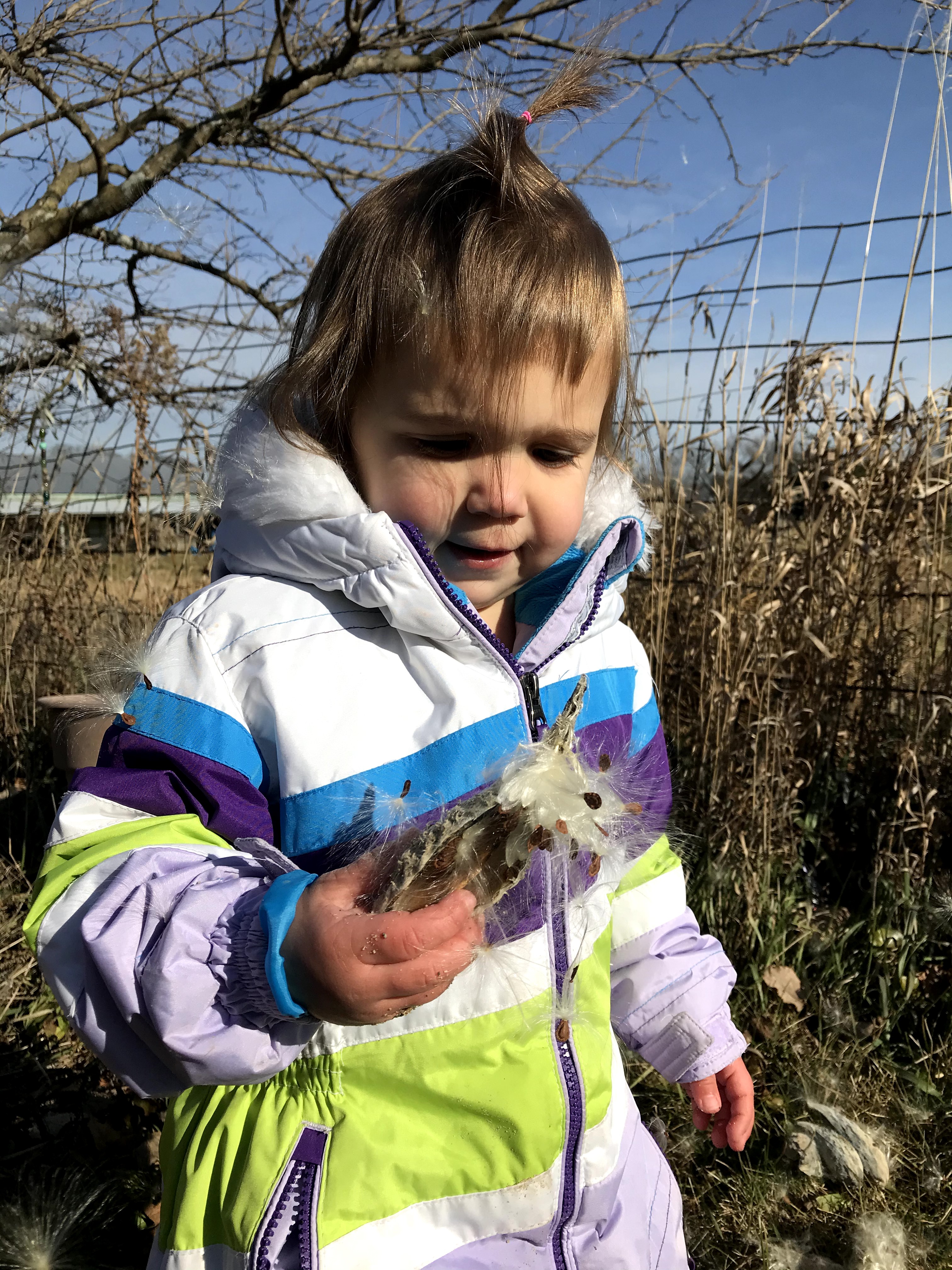 As the weather grew milder, we discovered leftover milkweed seed pods in the back yard. The silky fibers of the seeds were fun to touch and of course, were tons of fun to blow. We chased the seeds as they floated in the wind.